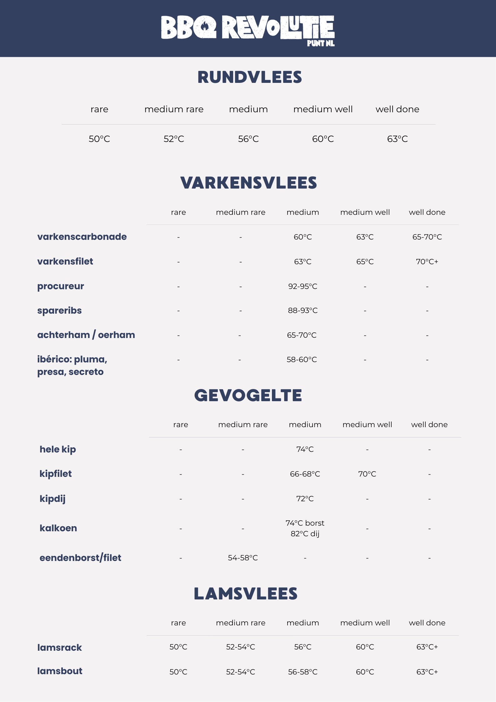 Het geheim van perfect gegaard vlees op de kamado zit ‘m in de kerntemperatuur. Met deze uitgebreide kerntemperatuurkaart heb je een compleet overzicht van de bekendste stukken vlees. Zo weet je precies wanneer elk stuk klaar is voor een sappige, smaakvolle maaltijd die elke keer weer indruk maakt.